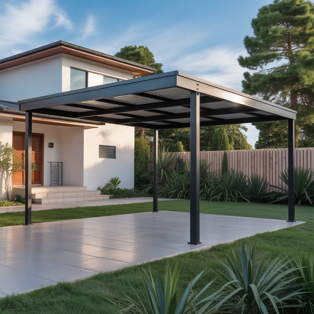 A sleek metal frame carport offers durability and a clean, contemporary appearance. Its minimalist design complements modern homes while providing strong weather protection. Powder-coated finishes keep the structure resistant to rust and wear. This option is low maintenance and long-lasting.