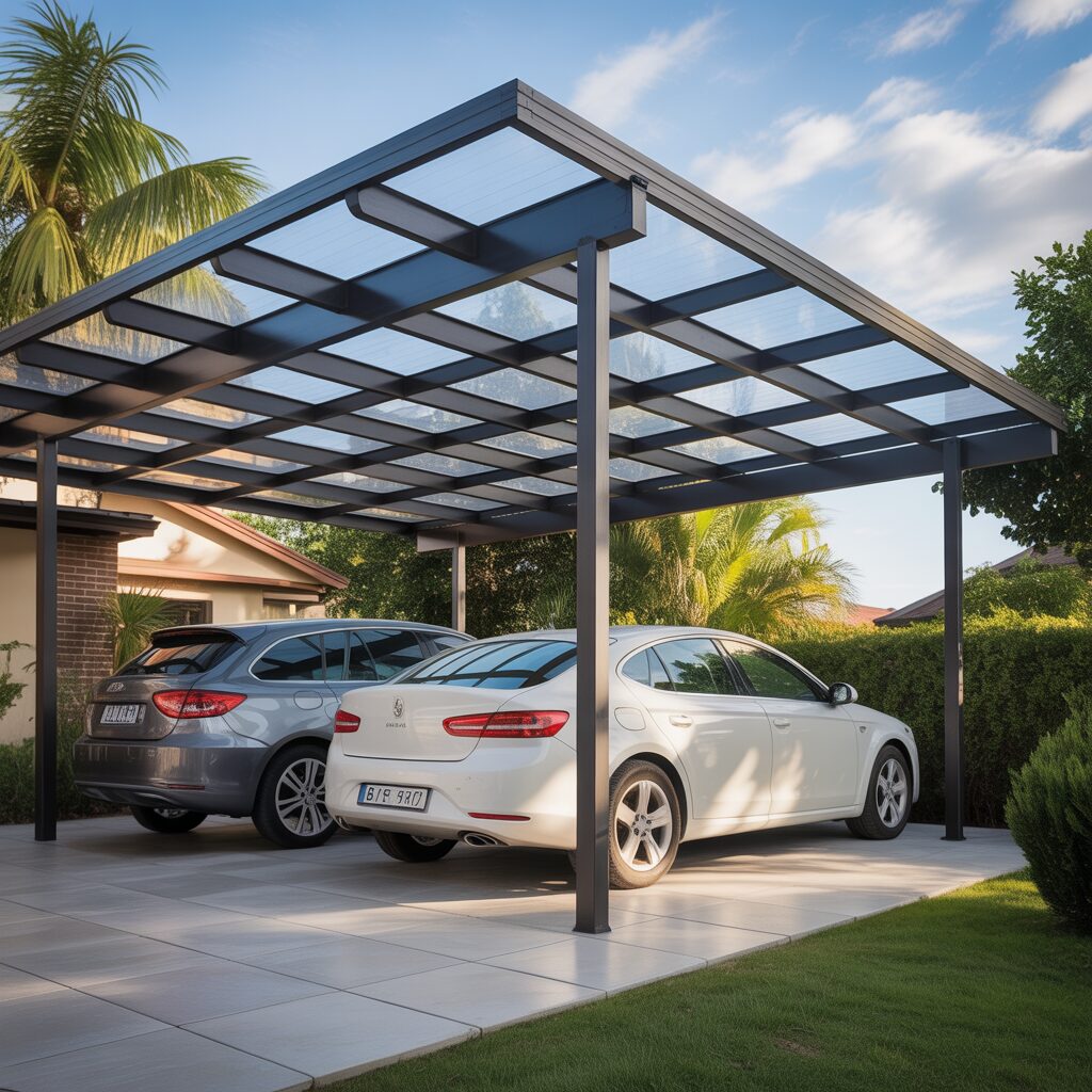 Polycarbonate panels allow natural light to filter through while blocking harmful UV rays. This creates a bright yet protective shelter for vehicles. The lightweight material is easy to install and available in different finishes. It’s perfect for homeowners who want a modern and airy feel.