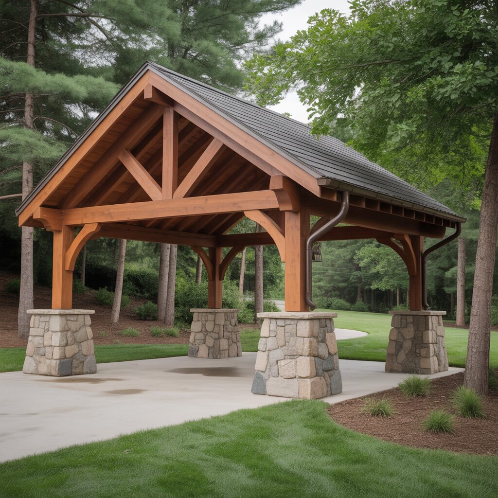Combining stone pillars with timber beams creates a strong and stylish carport. This design blends natural materials for a rustic, lodge-inspired look. It adds significant curb appeal while providing reliable shelter. Stone bases also enhance durability and stability.