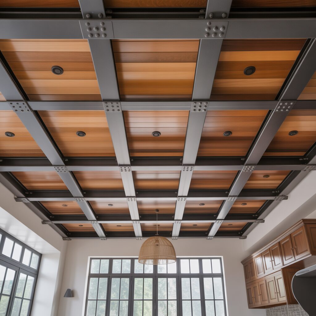 Combining materials like wood, metal, and glass creates a unique ceiling design. For example, wood panels framed with steel beams offer modern appeal. Mixing finishes allows customization to match your home’s character. This style is perfect for homeowners seeking originality.