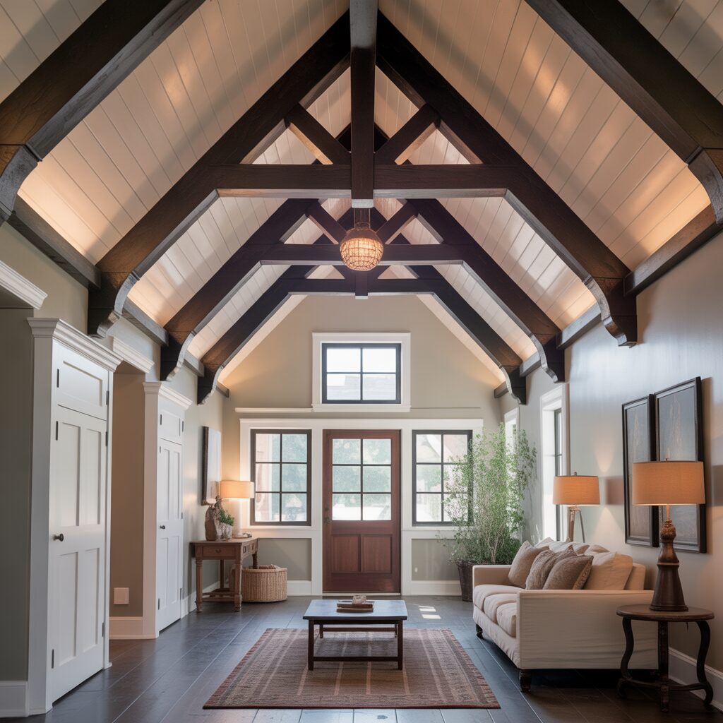 An exposed beam ceiling highlights the architectural structure of the gable. It creates depth while adding rustic character to the entryway. Dark-stained beams paired with lighter panels create a striking contrast. This look works beautifully with farmhouse and lodge-style homes.