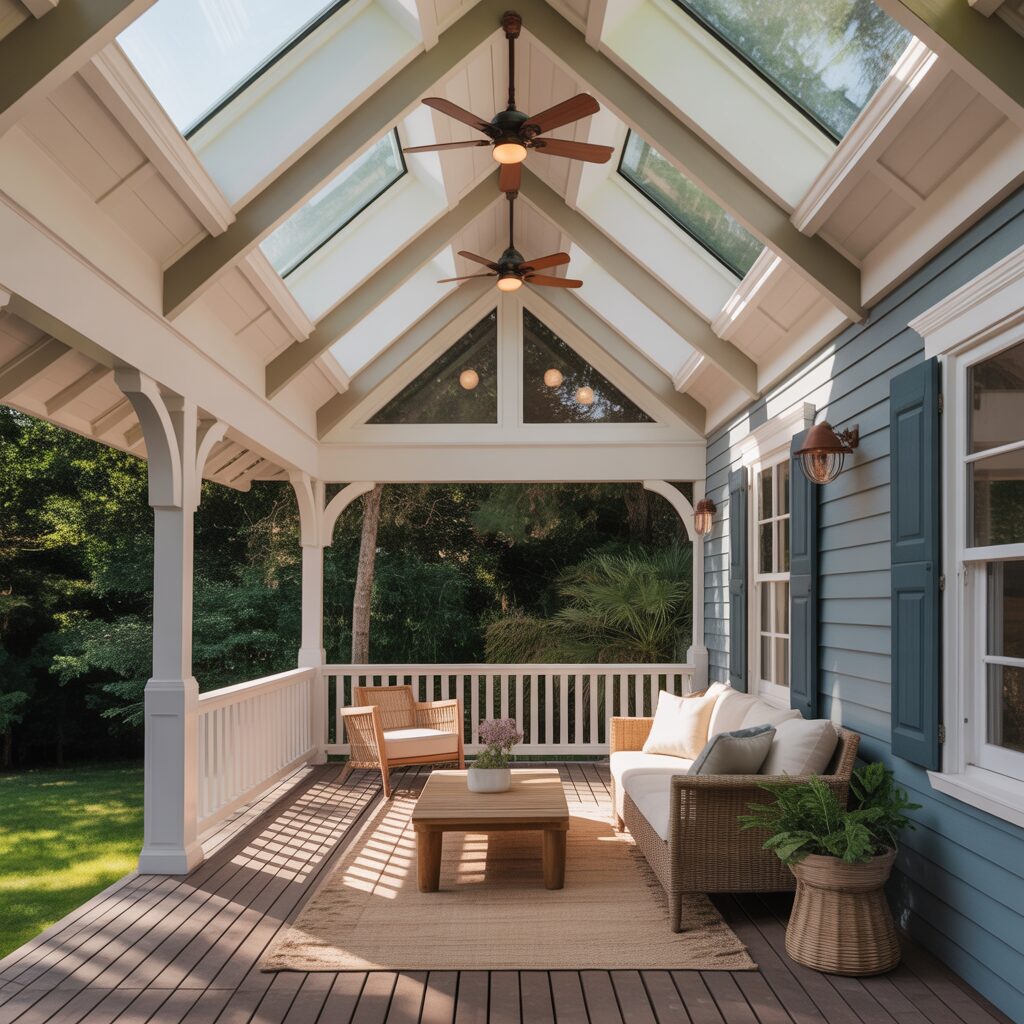 A vaulted gable ceiling with skylights enhances natural light and openness. The raised structure makes the porch feel larger and more inviting. Skylights add brightness during the day and a beautiful view of the night sky. It’s a modern yet timeless upgrade.