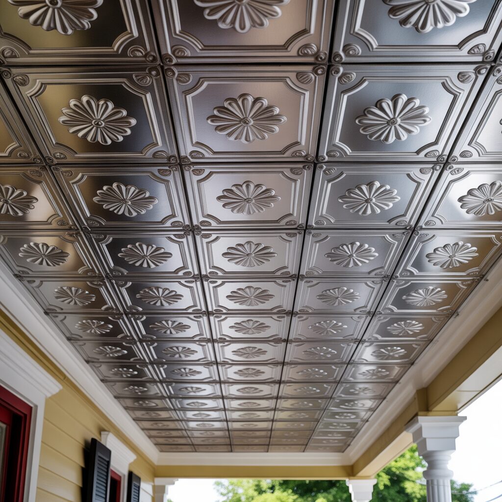 For a vintage or industrial touch, metallic ceiling panels make a bold choice. Pressed tin designs add texture and reflect light beautifully. These panels can be left in natural metallic tones or painted for a softer look. They bring character to any porch.