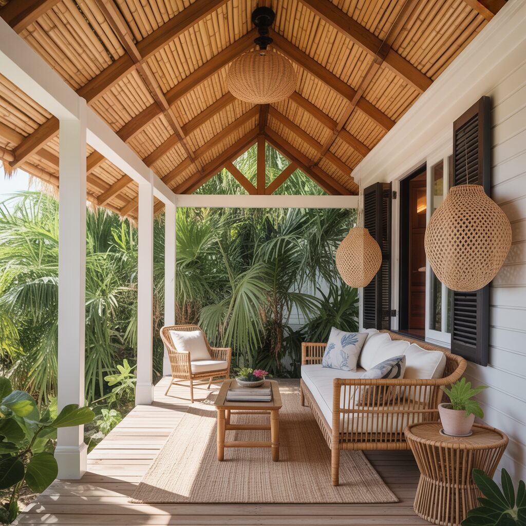 Bamboo ceilings bring an exotic, tropical feel to a gable porch. They’re lightweight, sustainable, and perfect for creating a relaxed, resort-inspired vibe. Bamboo works well with coastal and bohemian styles. It adds warmth and a sense of escape to the entrance.