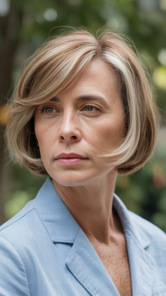 A medium-length cut with a deep side part instantly boosts volume. Strategic layers frame the face and add fullness to thin hair. This versatile style suits straight, wavy, or slightly curly hair. Itโs timeless, flattering, and easy to manage.
