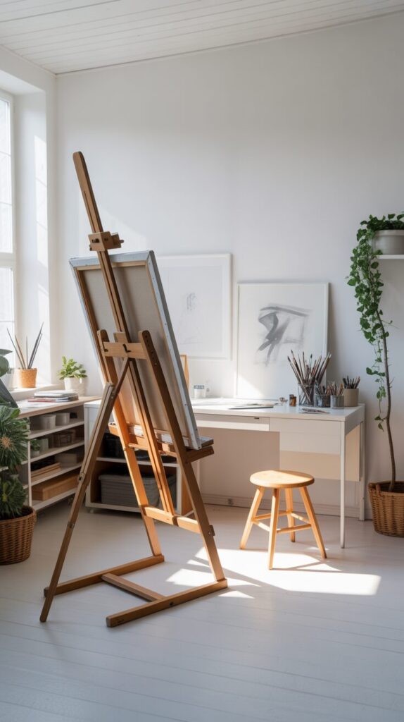 A clean, white room with a large easel and storage for paints. Minimal furniture helps you focus on creativity. Natural light enhances colors and mood. Add a few plants for freshness.