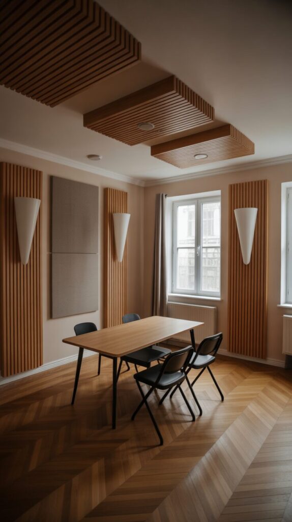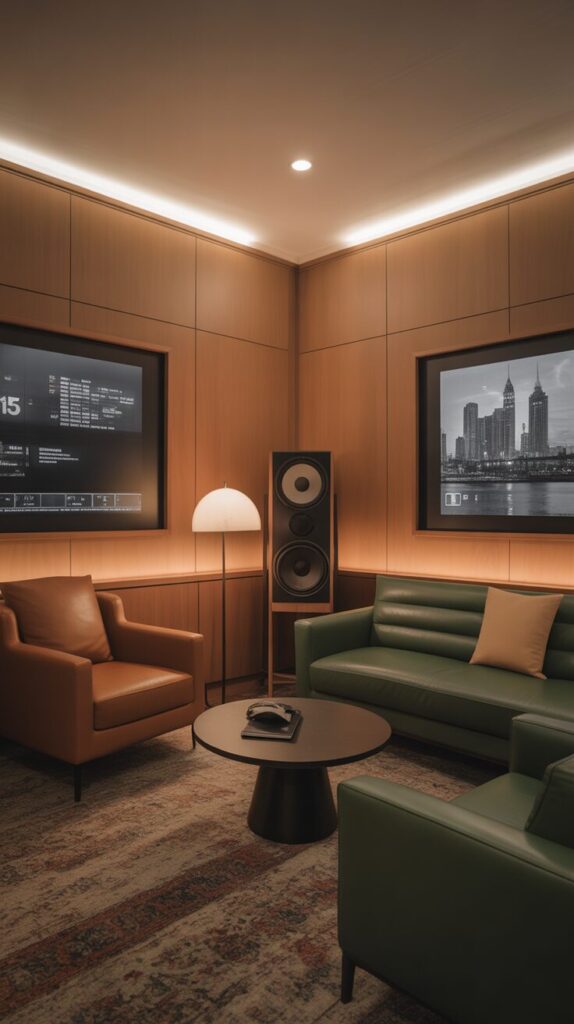 Soundproofed walls, comfortable seating, and instrument stands. Acoustic panels ensure quality sound. Include shelves for music sheets and headphones. Keep cables organized to reduce clutter.