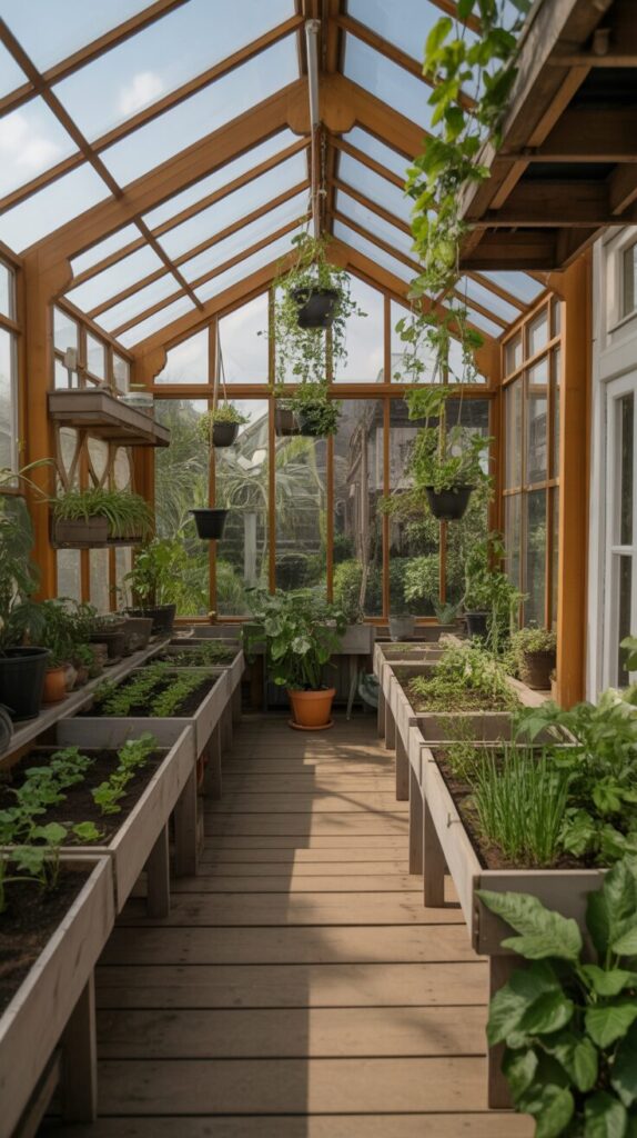 Shelves with potted plants and grow lights. Include a workbench for potting. Choose easy-to-maintain plants. Add natural elements for a calming vibe.