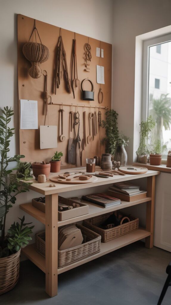 A large table with storage drawers and pegboards. Organize tools, scissors, and fabrics efficiently. Bright task lighting improves visibility. Colorful organizers keep the space lively.