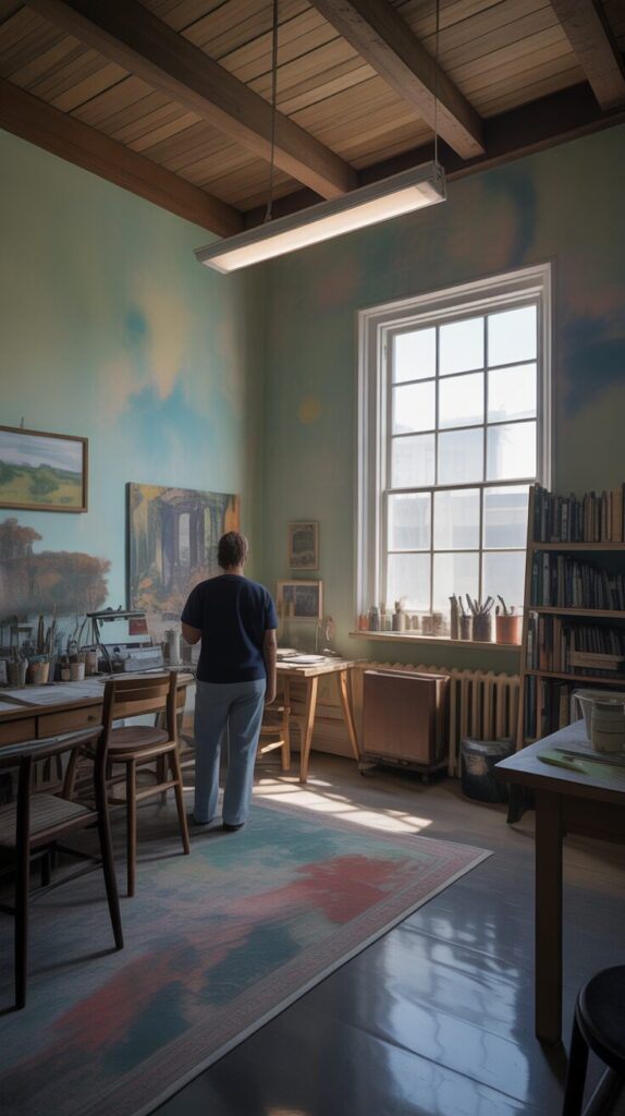 Large table, canvas storage, and easels. Use washable surfaces for easy cleanup. Bright, adjustable lighting helps with colors. Store brushes, paints, and palettes efficiently.