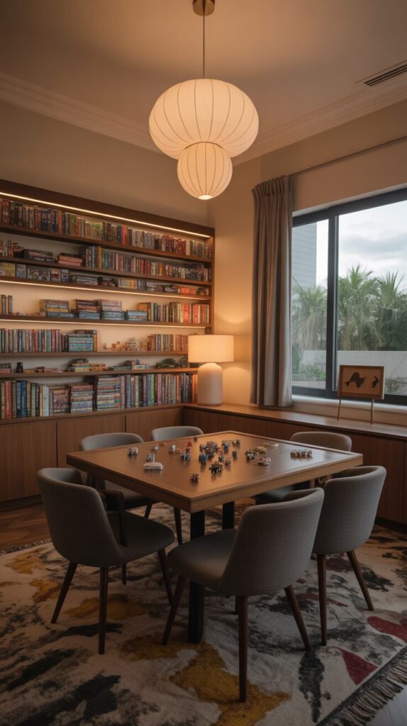 Table with seating for jigsaw puzzles or board games. Include shelves for games and storage boxes. Soft lighting creates cozy ambiance. Keep chairs comfortable for long sessions.