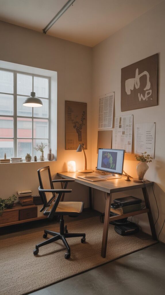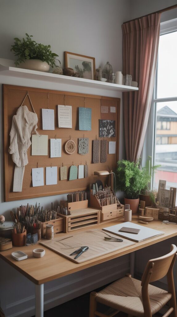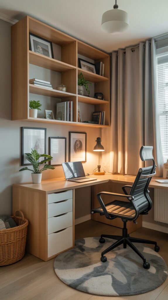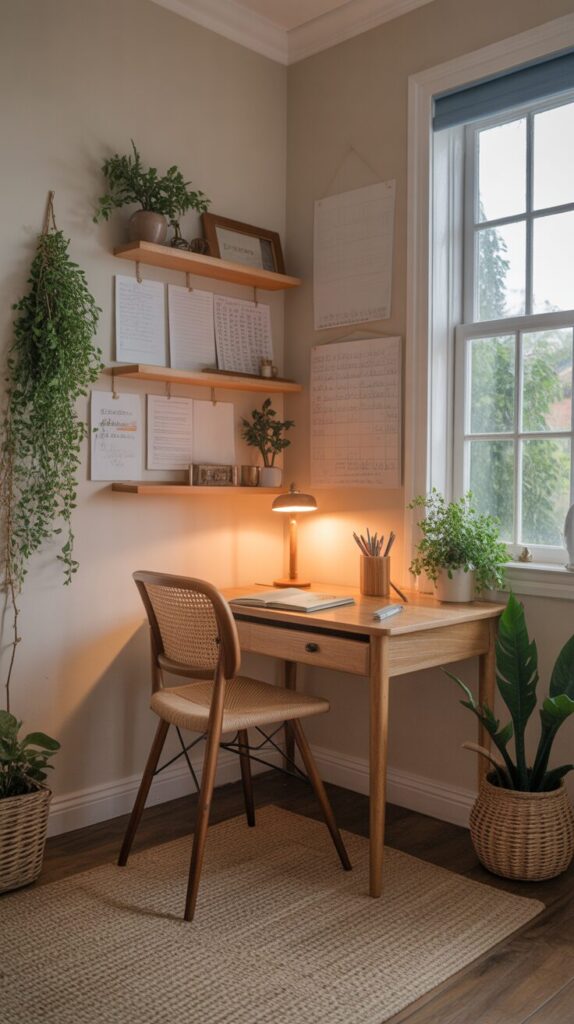 Desk with organizers, pens, and notebooks. Include comfortable chair and natural light. Add inspirational quotes or wall art. Keep supplies within reach for efficiency.