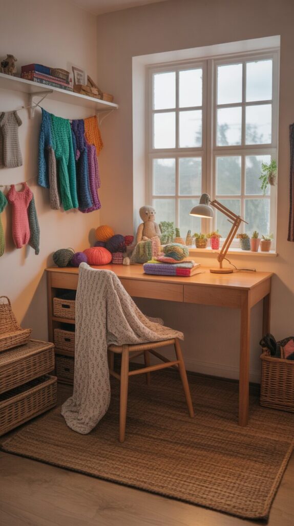 Armchair, basket of yarn, and project table. Good lighting improves stitching accuracy. Add a blanket for warmth. Keep patterns and tools organized in drawers or boxes.