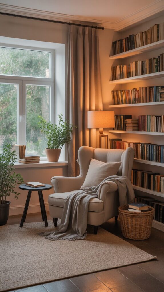 Soft armchairs, bookshelves, and warm lighting create the perfect literary retreat. Add a throw blanket and cushions for comfort. Position near a window for natural daylight. Include a small side table for drinks or notebooks.