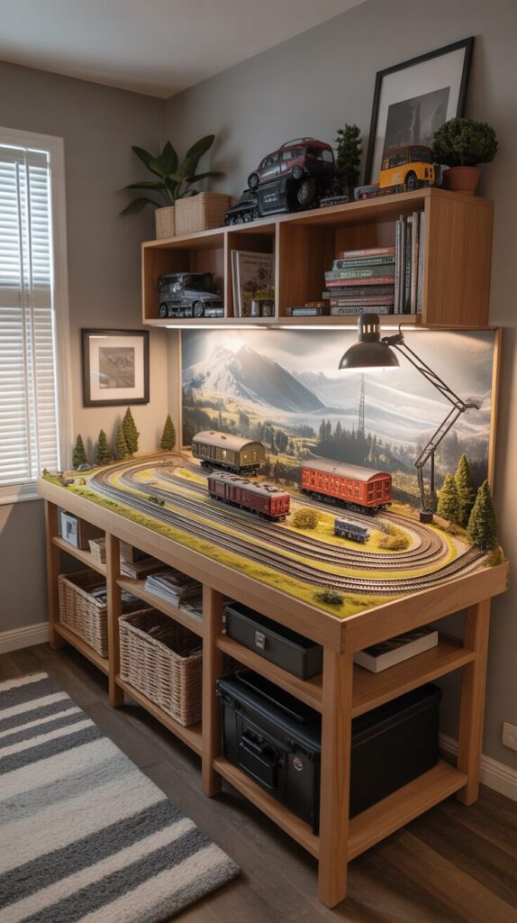 Dedicated table for tracks and scenery. Storage for trains and miniature accessories. Use shelving for display and organization. Include proper lighting for details.