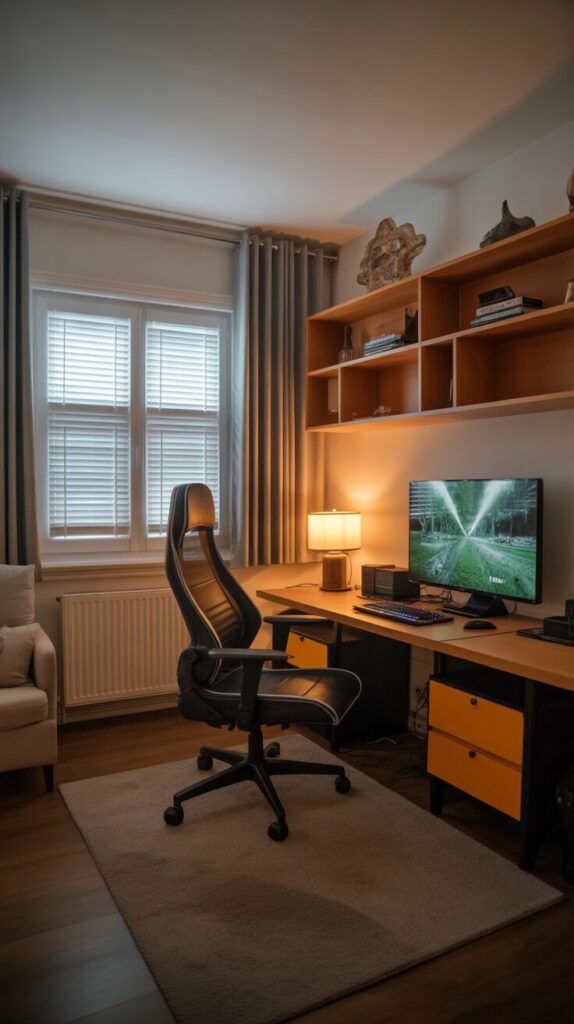 LED lighting, comfortable chairs, and monitor setup for immersive experience. Soundproof walls reduce distractions. Use themed decorations for a personal touch. Include storage for controllers and accessories.