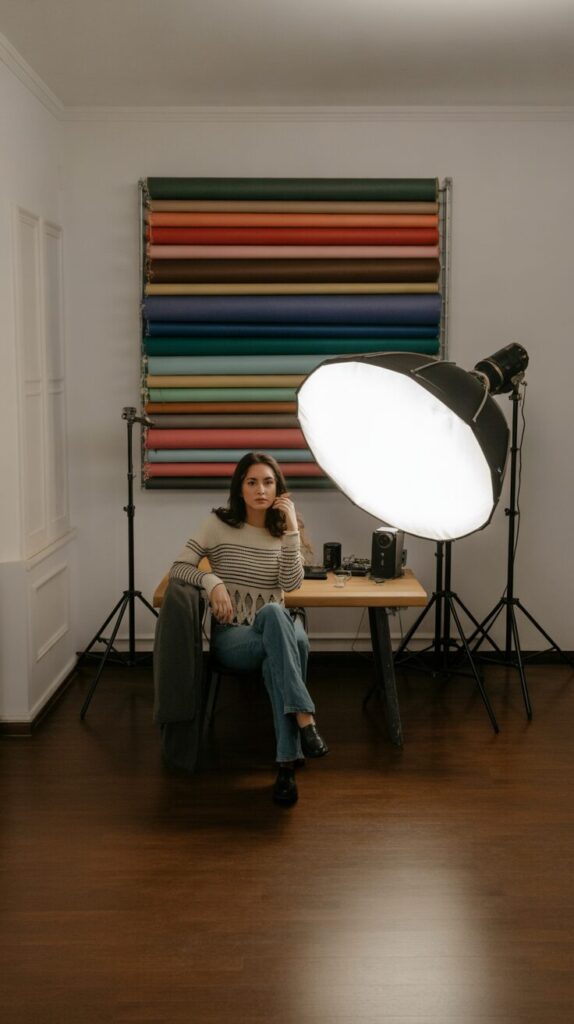 Backdrop stands, tripod storage, and proper lighting. Include shelves for lenses and camera accessories. Neutral walls enhance photo quality. Keep cables and equipment tidy for easy setup.
