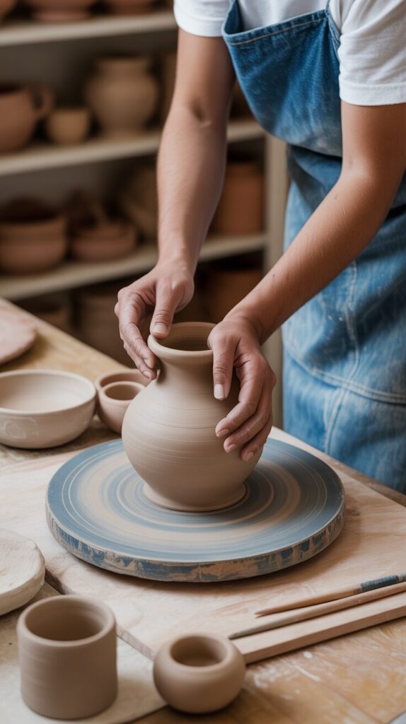 A sturdy work table and shelves for clay and tools. Add aprons and sink area for cleaning. Ensure natural light or task lighting. Store finished pieces safely to avoid damage.