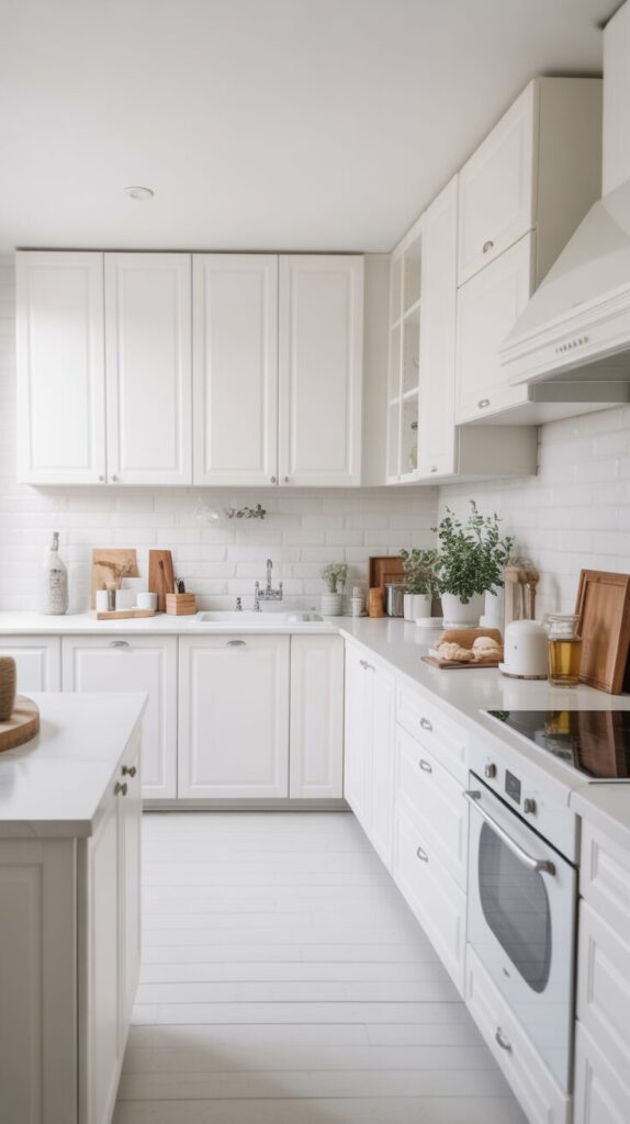 Create clean, serene beauty through an all-white color scheme featuring white cabinets, white countertops, white tile, and white walls that maximize light and create spa-like calm throughout. The monochromatic white palette eliminates visual distraction, makes spaces feel larger and brighter, and provides the perfect neutral backdrop for adding natural elements, greenery, or subtle metallic accents strategically. Vary textures to prevent flatness—combine matte white cabinets with glossy white tile, smooth countertops with textured white brick walls—creating dimensional interest without introducing color that disrupts serenity. Keep surfaces clutter-free by storing appliances, dish soap, and everyday items in cabinets, maintaining the pristine appearance that makes all-white kitchens so visually stunning and peaceful consistently. This minimalist approach creates timeless elegance that never dates, photographs beautifully, and provides calming environment that makes cooking and gathering feel like luxurious experiences rather than mundane chores.