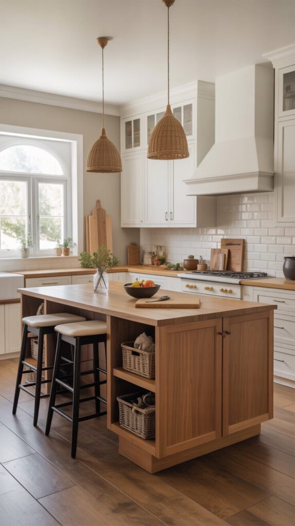Install a kitchen island with legs or open base rather than solid cabinet construction, creating furniture-like appearance that feels less built-in and more elegant than standard cabinetry-style islands throughout. The floating or legged design allows light to flow underneath, making the space feel less heavy and more open while providing opportunity for decorative styling with baskets or stools tucked beneath. Choose contrasting color or material for the island—perhaps wood island with white perimeter cabinets, or painted island against natural wood cabinets—creating intentional focal point that anchors the kitchen aesthetically. Style the island minimally on top, perhaps with a cutting board, bowl of fruit, or small plant arrangement rather than cluttering this beautiful feature with appliances and kitchen chaos. This furniture-inspired approach creates more sophisticated, custom appearance compared to standard island designs while maintaining full functionality for cooking, eating, and gathering activities essential to modern kitchen living.
