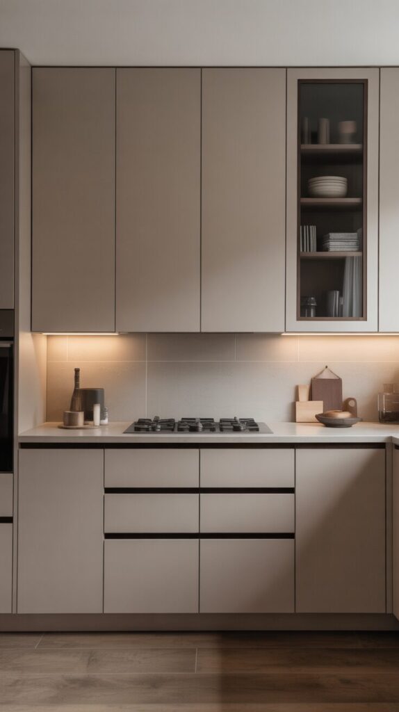 Choose modern handleless cabinets with push-to-open mechanisms or integrated pulls that create clean, uninterrupted lines and streamlined aesthetic eliminating visual hardware clutter completely throughout your kitchen design. The seamless cabinet faces allow the eye to appreciate the overall design, color, and material without distraction from dozens of handles breaking up surfaces and creating visual noise unnecessarily. This minimalist approach works particularly well with flat-front or slab-style cabinet doors, emphasizing clean geometry and modern sophistication that photographs beautifully for social media and design portfolios. Install lighting under upper cabinets or inside glass-front cabinets to add subtle visual interest since the lack of hardware means fewer decorative elements breaking up expansive cabinet surfaces throughout. The handleless design represents the pinnacle of aesthetic minimalism, proving that removing elements often creates more impactful design than adding decorative features that compete for attention in busy spaces.