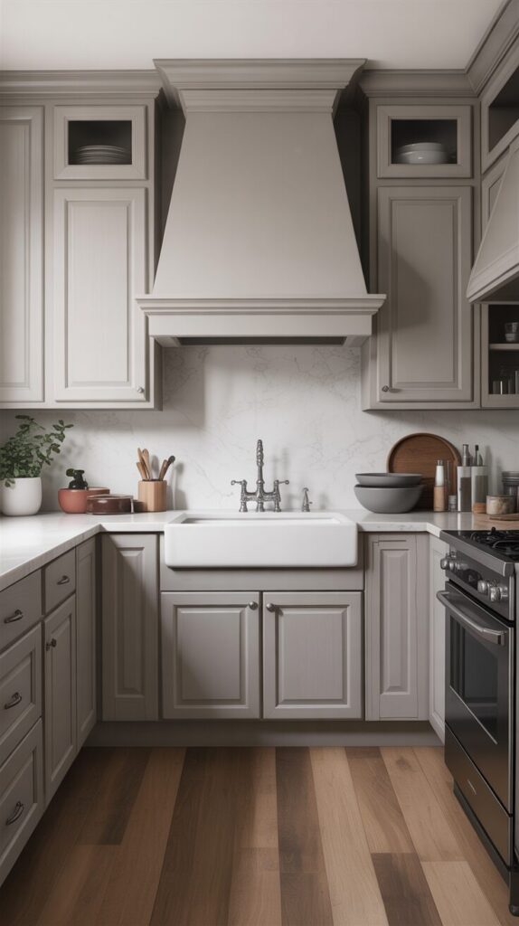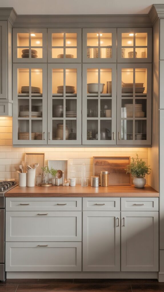 Replace some solid cabinet doors with glass-front versions that display beautiful dishware while maintaining dust protection and creating visual lightness in upper cabinets that might otherwise feel heavy throughout. Choose cabinets flanking windows, on either side of the range hood, or in specific sections rather than all upper cabinets, creating intentional display areas while maintaining concealed storage for less attractive necessities. Style glass-front cabinets carefully with cohesive colors and organized arrangements—stacked white dishes, glassware by type, matching storage containers—ensuring what’s visible enhances rather than detracts from your aesthetic goals. Consider interior cabinet lighting that illuminates displayed items, creating jewelry-box effect and adding ambient lighting that makes kitchens feel warm and inviting during evening hours consistently. The glass-front cabinets provide opportunity to showcase beautiful items while forcing you to maintain organization and visual appeal, supporting the aesthetic goals you’ve established for your kitchen sanctuary.