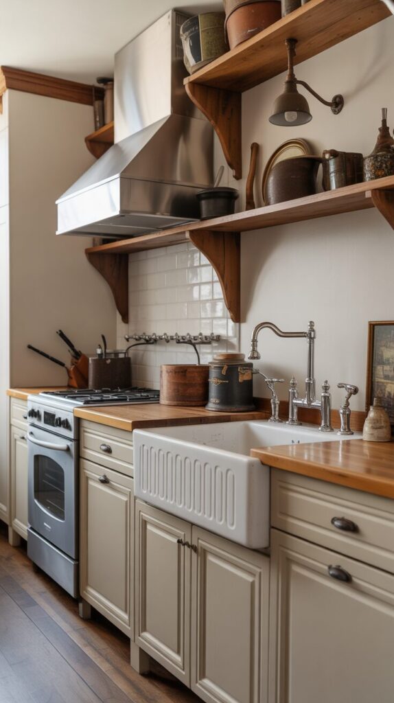 Incorporate vintage or vintage-style elements like farmhouse sinks, vintage-look faucets, antique-inspired lighting, or retro appliances that add character and warmth to otherwise modern aesthetic kitchens beautifully. Choose reproductions that offer vintage aesthetics with modern functionality if authentic antiques don’t meet your practical needs for durability, warranty coverage, or specific features required for contemporary cooking. Mix vintage elements with modern components rather than creating theme kitchen—perhaps a farmhouse sink with sleek modern cabinets, or vintage pendant lights over contemporary island creating interesting tension and layered design. The vintage touches add soul and personality that brand-new everything can lack, creating kitchens that feel collected over time rather than installed completely in single renovation project recently. These character-rich details distinguish your aesthetic kitchen from generic modern designs, proving that beauty comes from thoughtful mixing rather than strict adherence to single style or period throughout every element.