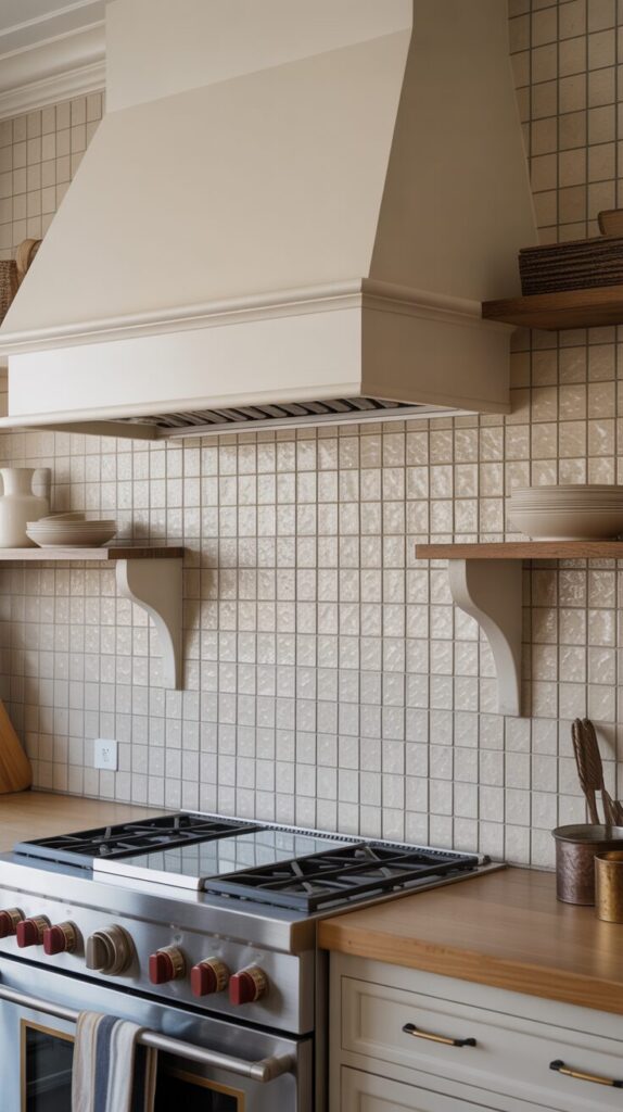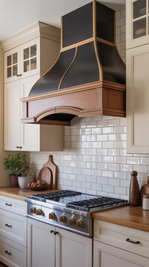 Install a dramatic range hood in contrasting material or color that becomes the kitchen’s architectural focal point while providing essential ventilation for cooking activities and air quality maintenance. Choose from options like sleek black metal, natural wood, textured plaster, or decorative tile that stands out against your cabinet and wall colors, creating intentional contrast rather than trying to hide this necessary element. Consider oversized hoods that extend beyond the cooktop width, arched European-style designs, or modern geometric shapes that transform functional ventilation into sculptural art commanding attention in your kitchen. The statement hood anchors your cooking zone, provides vertical interest on what’s often a large blank wall, and demonstrates that practical elements can be beautiful when designed thoughtfully and intentionally. Style the hood’s surrounding area minimally to let this architectural element shine without competing decorations cluttering the visual impact you’ve created through this bold design choice.