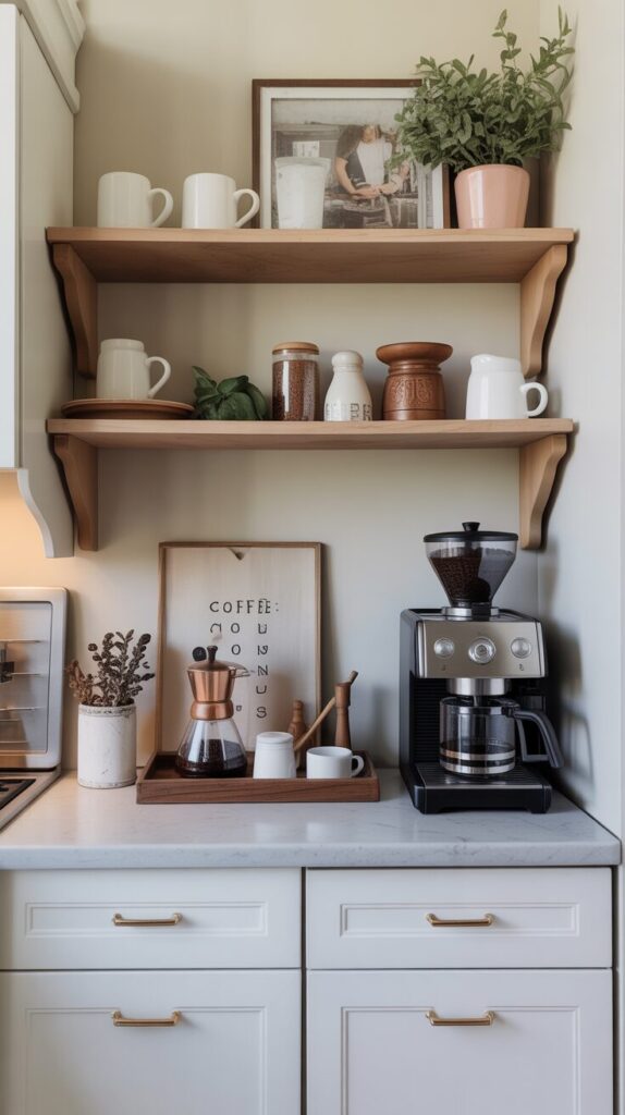 Create a beautiful, functional coffee station with dedicated counter space, storage for mugs and supplies, and attractive coffee maker or espresso machine displayed rather than hidden away in cabinets daily. Style the station with aesthetic accessories—a tray organizing coffee supplies, attractive canister for beans, pretty sugar bowl, vintage artwork, or small plant—creating vignette worthy of lifestyle blogs and social media. Position the coffee station near the refrigerator for convenient milk access and away from primary cooking zones, creating dedicated morning ritual space that doesn’t interfere with meal preparation activities happening simultaneously. Choose an attractive coffee maker that contributes to your aesthetic rather than detracting—perhaps a copper espresso machine, minimalist pour-over setup, or vintage-inspired percolator that serves as functional art. The dedicated station elevates your daily coffee routine into special ritual while keeping all supplies organized, accessible, and beautifully displayed rather than scattered throughout cabinets creating morning chaos.