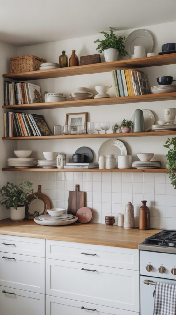 Replace upper cabinets with open wooden or floating shelves displaying carefully curated collections of beautiful dishes, glassware, cookbooks, and decorative objects arranged with artistic intention rather than random placement. Choose cohesive color schemes for displayed items—all white dishes, all natural wood, or coordinating pastels—creating visual harmony that appears intentional rather than cluttered or chaotic throughout your open shelving. Include plants, artwork, or decorative objects among functional items to create balanced vignettes that look styled rather than purely utilitarian, elevating everyday storage to decorative art form consistently. Organize items by frequency of use, keeping everyday dishes at easy reach while decorative pieces occupy higher shelves, ensuring practicality doesn’t suffer for beauty in your aesthetic kitchen design. The open shelving forces you to maintain organization and visual appeal, ensuring your kitchen remains Instagram-ready while providing easy access to items you use daily for cooking and entertaining.