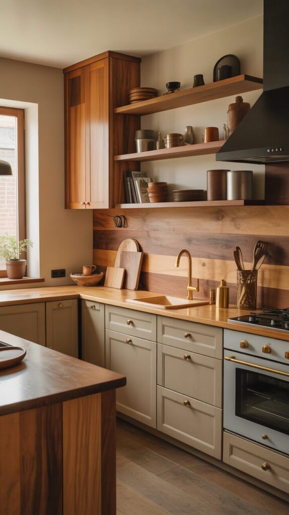 Incorporate warm natural wood through cabinets, open shelving, butcher block countertops, or wood beams that create organic beauty and cozy atmosphere within your aesthetic kitchen space. Choose lighter woods like oak, maple, or birch for Scandinavian-inspired brightness, or embrace richer walnut and teak for more dramatic warmth that grounds the space with sophisticated depth. Pair wood elements with warm neutrals like cream, beige, terracotta, or soft gray that complement rather than compete with wood’s natural beauty and organic grain patterns visible throughout. Add brass or gold hardware, fixtures, and accents that enhance the warm palette while providing metallic shine that catches light and adds subtle glamour without overwhelming the natural aesthetic. This warm, organic approach creates inviting kitchens that feel lived-in yet polished, proving that aesthetic spaces can be welcoming and comfortable rather than cold showrooms nobody actually uses regularly.