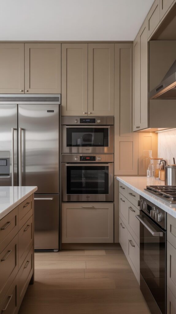 Create seamless, streamlined appearance by choosing integrated appliances with cabinet panels matching your cabinetry, hiding refrigerators, dishwashers, and other appliances for cohesive, uncluttered aesthetic throughout. The integrated approach eliminates the visual disruption of stainless steel or colored appliances breaking up cabinet lines, allowing your eye to flow smoothly around the space without jarring interruptions. While integrated appliances cost more than standard options, they dramatically improve aesthetics by creating custom, high-end appearance that makes kitchens look professionally designed rather than contractor-grade basic installations. Choose handleless cabinets with push-to-open mechanisms to further streamline appearance, eliminating hardware that can create visual clutter even when cabinets match perfectly in color and material. This investment in seamless design creates magazine-worthy kitchens where form and function coexist beautifully without visible compromises between aesthetics and necessary modern appliances required for contemporary cooking.