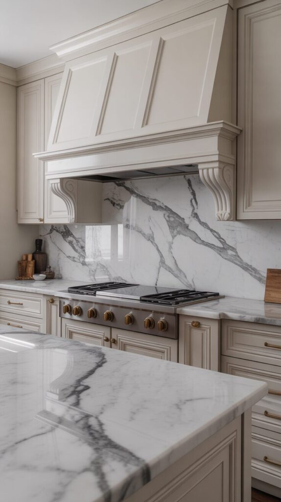 Install luxurious countertops in marble, quartz, or marble-look quartz that provide elegant surfaces with subtle veining patterns adding organic visual interest without overwhelming the space with color or pattern. The natural stone appearance elevates kitchens instantly, providing that high-end, timeless quality associated with luxury design while offering practical, durable work surfaces for daily cooking and food preparation. Choose white or cream-based stones with soft gray veining for classic elegance, or embrace bolder options like black marble or dramatic quartzite for more contemporary, striking aesthetic impact throughout. Extend countertop material up the wall behind the cooktop or sink as a backsplash, creating seamless, sophisticated appearance that eliminates grout lines and allows the stone’s beauty to shine dramatically. The luxurious countertops become the kitchen’s jewelry, elevating the entire space through their inherent beauty and the craftsmanship visible in their installation and finishing details throughout.