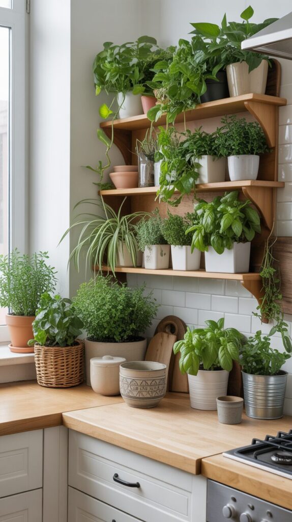 Incorporate abundant greenery through potted plants on counters, hanging plants above windows, herb gardens on windowsills, or even living walls that bring life and natural beauty into your aesthetic kitchen. Choose low-maintenance varieties that thrive in kitchen conditions—pothos, spider plants, herbs like basil and mint, or small succulents—ensuring your green additions remain healthy rather than becoming dead plant graveyard over time. Use beautiful containers coordinating with your aesthetic—ceramic pots in neutral tones, woven baskets, vintage crocks, or modern geometric planters—so the vessels themselves contribute to your kitchen’s design story. The living plants purify air, provide fresh cooking ingredients at your fingertips, add organic color and texture, and create that essential connection to nature that makes spaces feel healthy and alive. Group plants in odd numbers (3, 5, 7) at varying heights to create visually pleasing arrangements that appear intentional and designed rather than randomly placed wherever space existed coincidentally.