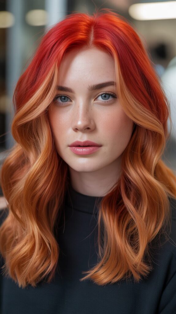 Go bold with a vibrant red base color enhanced by copper and strawberry blonde highlights that create dimension, warmth, and eye-catching brilliance perfect for winter. Choose a red shade that complements your skin tone—blue-based reds for cool undertones, orange-based reds for warm undertones—ensuring the color enhances your natural coloring rather than clashing. Add strategic copper highlights around the face and throughout the hair to break up solid red and create natural-looking depth that prevents the color from appearing flat. Maintain this high-maintenance color with color-safe products, avoid hot water that strips color, and schedule regular glossing treatments that refresh vibrancy between full color appointments. This head-turning shade makes an undeniably bold statement that pairs beautifully with winter’s neutral clothing palette while expressing passionate, fiery personality through your hair color choice.
