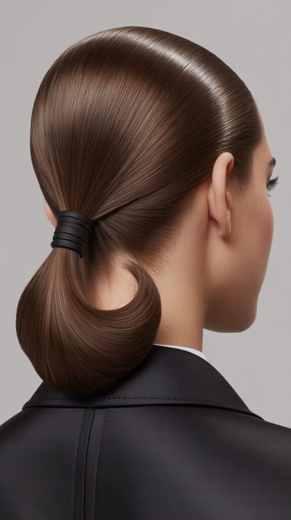 Create a polished, powerful look by slicking hair into an ultra-smooth low ponytail positioned at the nape with a deep, dramatic side part that adds architectural interest. Use strong-hold gel or pomade to achieve perfectly sleek sides without any bumps, flyaways, or texture, creating a wet-look finish that appears intentionally styled rather than casual. Wrap a small section of hair around the elastic to conceal it, securing with bobby pins underneath for a polished detail that elevates this simple style into something more sophisticated. The deep side part creates asymmetry that adds visual interest to an otherwise minimalist style, demonstrating that bold doesn’t always mean colorful or textured—sometimes it means precision. This sleek style works beautifully for formal winter events, professional settings, or anytime you want to project confidence and sophistication through severe, intentional styling that commands attention.