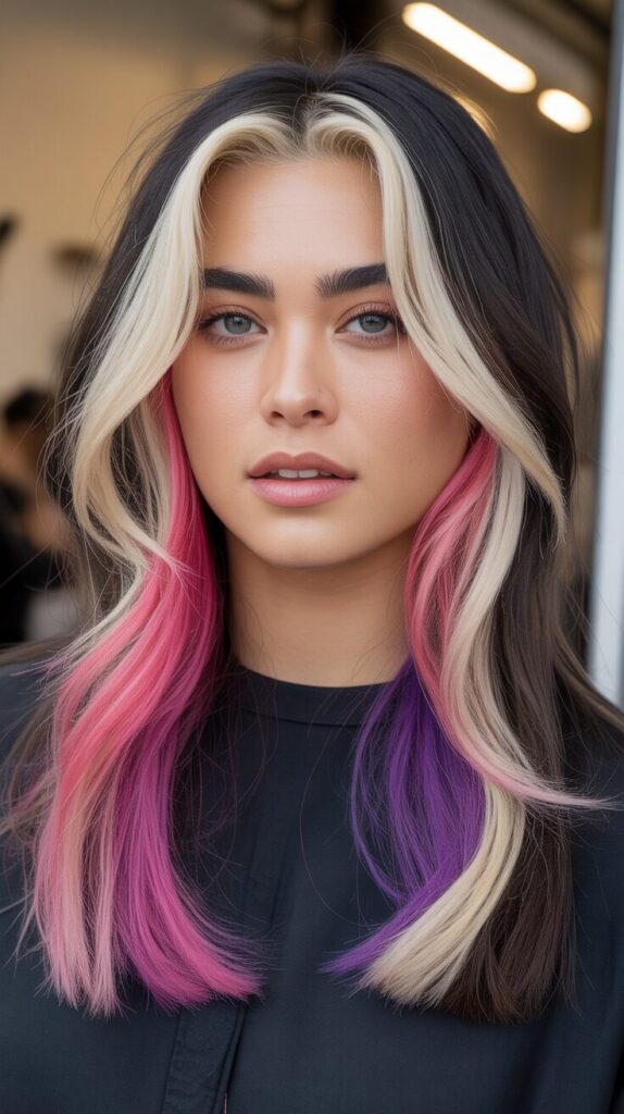 Embrace the bold early-2000s trend of thick, visible highlights in colors that dramatically contrast with your base, creating intentional stripes rather than subtle dimensional blending. Choose contrasting colors like platinum chunks in dark brown hair, bright blonde pieces in black hair, or even unconventional colors like pink or purple for maximum impact. Ask your colorist for wider sections than traditional highlights, creating visible bands of color throughout your hair that make an obvious, unapologetic statement about your bold style. This high-contrast look requires confidence to pull off since it’s intentionally visible and attention-grabbing rather than trying to look natural or sun-kissed like traditional highlighting techniques. Maintain the contrast with regular toning appointments that keep both the base and highlight colors vibrant, preventing the bold look from fading into muddy, undefined tones.