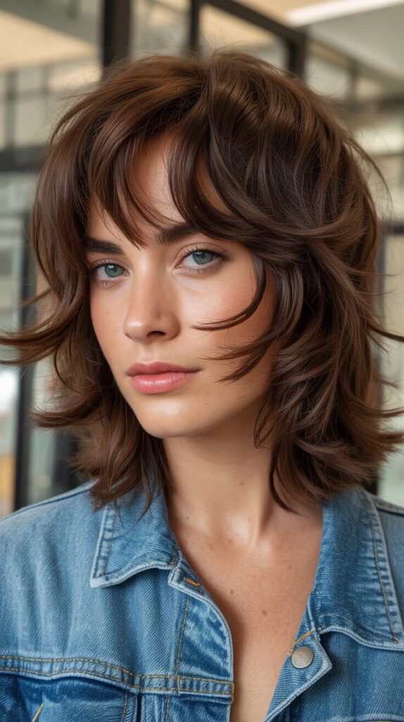 Opt for a heavily layered, textured shag cut with face-framing curtain bangs that part down the middle, creating rock-and-roll vibes with modern, effortless appeal. Ask your stylist for lots of choppy layers throughout, with the shortest layers at the crown creating volume and longer pieces around the face adding softness and movement. Style with texturizing spray and a diffuser to enhance natural texture, or use a curling iron to create loose, messy waves that emphasize the shaggy, lived-in appearance. The curtain bangs should be cut to graze your cheekbones, parting naturally in the middle and blending seamlessly into the longer face-framing layers on either side. This retro-inspired cut works for various hair types and lengths from shoulder to chest, offering bold style that’s surprisingly low-maintenance for everyday wear.