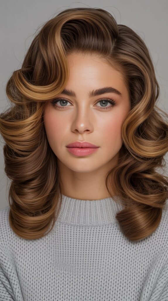 Embrace retro glamour with big, bouncy curls featuring maximum volume at the crown, dramatic face-framing layers, and a center part that channels iconic 1970s bombshell energy. Use large barrel curling irons or hot rollers to create substantial curl size, then brush through with a paddle brush for soft, flowing waves rather than defined ringlets. Tease the crown section generously for authentic 70s height, spray with strong-hold hairspray, and gently smooth the surface while maintaining volume underneath for polished finish. Apply shine serum or oil to the ends for healthy-looking gloss that enhances the glamorous, larger-than-life quality of this statement style perfectly suited for winter parties. This bold hairstyle works best on medium to long hair and pairs beautifully with winter’s cozy sweaters, creating intentional contrast between casual clothing and dramatic hair.