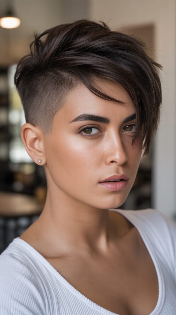 Choose a dramatically asymmetrical pixie with one side cut very short against the head while the other side maintains length that can be swept across the forehead or styled upward. The extreme difference between sides creates instant visual interest and shows fearless confidence in your personal style, making this one of the boldest short haircuts available. Style the longer side with pomade or wax to create intentional texture, spikes, or sleek smoothness depending on your mood and the occasion’s formality level throughout the day. Keep the short side freshly buzzed with regular trims every 3-4 weeks, maintaining the dramatic contrast that makes this cut so striking and prevents it from growing out awkwardly. This edgy style works particularly well for those with strong facial features, oval or heart-shaped faces, and the confidence to handle the attention this unconventional cut inevitably attracts.