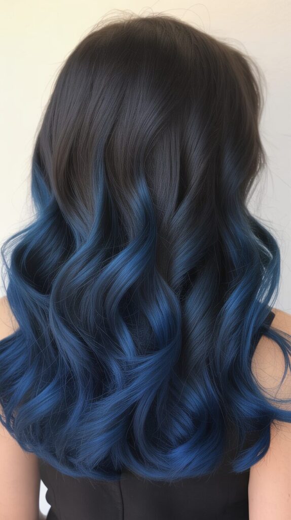 Create mysterious depth with a color gradient that starts with deep, true black at the roots and gradually transitions into rich midnight blue at the mid-lengths and ends. This subtle yet striking color combination appears almost black in low light but reveals stunning blue tones in sunlight, creating dynamic color that changes throughout the day. The dark-to-dark ombre is more subtle than traditional blonde ombre, making it appropriate for professional settings while still offering bold style and personal expression through color. Request a very gradual blend between the black and blue sections, ensuring there’s no harsh line of demarcation that looks unnatural or obviously color-treated rather than multidimensional. This sophisticated color choice requires less maintenance than lighter shades, with roots blending naturally as hair grows and less frequent touch-ups needed to maintain the dramatic effect.