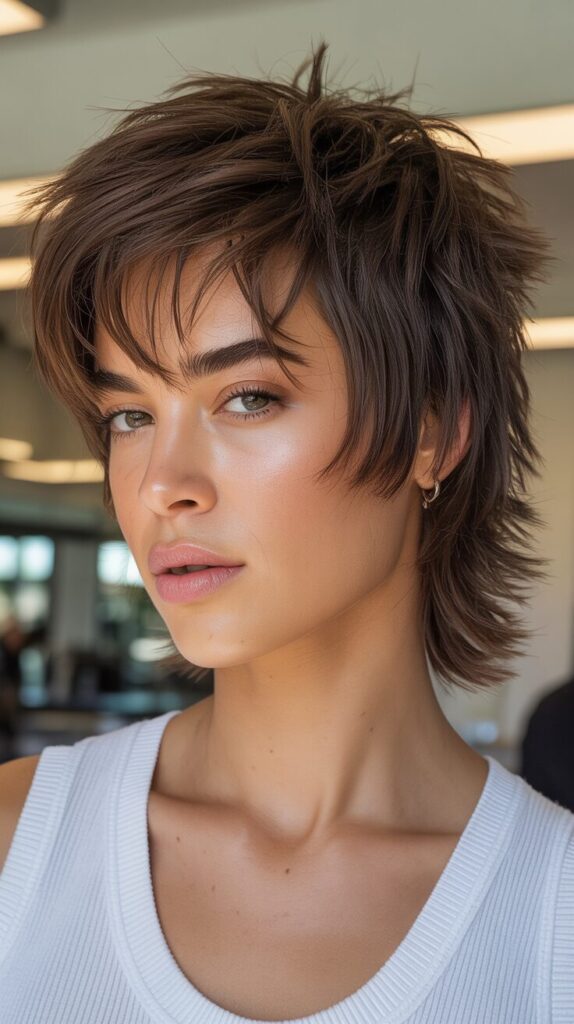 Try the trendy wolf cut featuring heavy layers throughout, shaggy texture, volume at the crown, and a mullet-inspired silhouette with shorter front sections and longer back pieces. This bold, fashion-forward cut combines elements of shags and mullets, creating a unique hybrid style that’s been embraced by celebrities and fashion influencers worldwide for its edgy versatility. Ask your stylist for significant layering starting at the crown, choppy cutting techniques that create texture rather than blunt lines, and maintained length in the back for authentic wolf cut proportions. Style with sea salt spray and air-dry for natural, effortless texture, or use a blow dryer and round brush to create more polished volume while maintaining the intentionally messy aesthetic. This daring cut works on various hair textures from straight to wavy, offering bold style that’s surprisingly easy to maintain with minimal daily styling required.