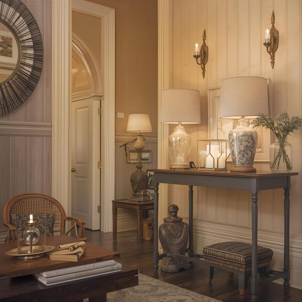 Cottage interiors thrive on soft, layered lighting rather than harsh overhead fixtures. Table lamps, wall sconces, and candles set a warm and inviting mood. Lampshades in fabric or wicker add extra charm. Evening candlelight enhances the romantic atmosphere.