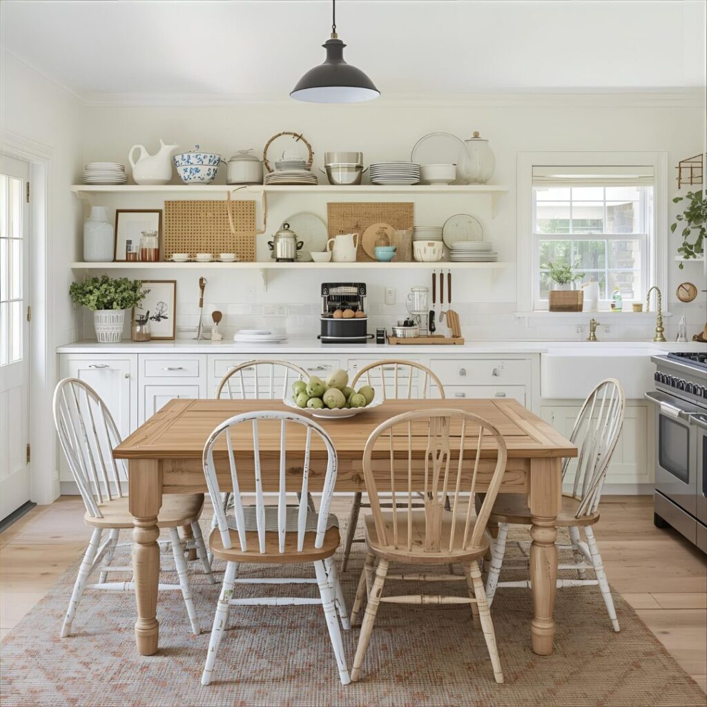 The kitchen is often the heart of a cottage home. A sturdy wooden farmhouse table surrounded by mismatched chairs is both functional and stylish. Open shelving with crockery on display adds to the charm. Pair these with vintage cookware for a lived-in feel.