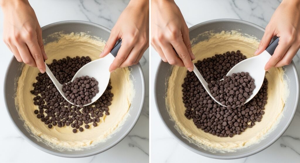 Gently stir in chocolate chips with a spatula, ensuring they’re evenly distributed throughout the dough.