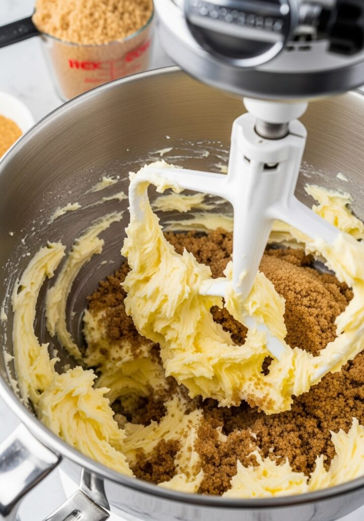 Start by beating together softened butter, granulated sugar, and brown sugar until light and fluffy. This step introduces air, which helps cookies rise.