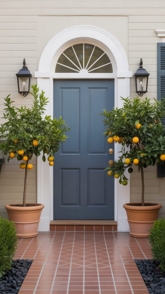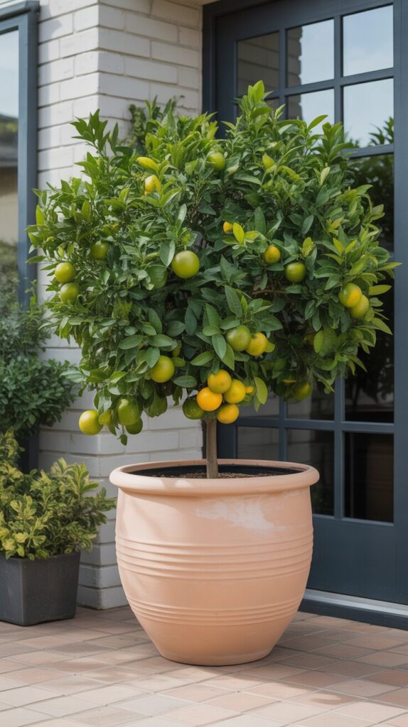 Placing tall citrus planters on each side of an entryway creates a grand, welcoming look. The glossy leaves and colorful fruits act as natural décor, boosting curb appeal while filling the air with a refreshing aroma. This setup works beautifully for both front doors and backyard patios.