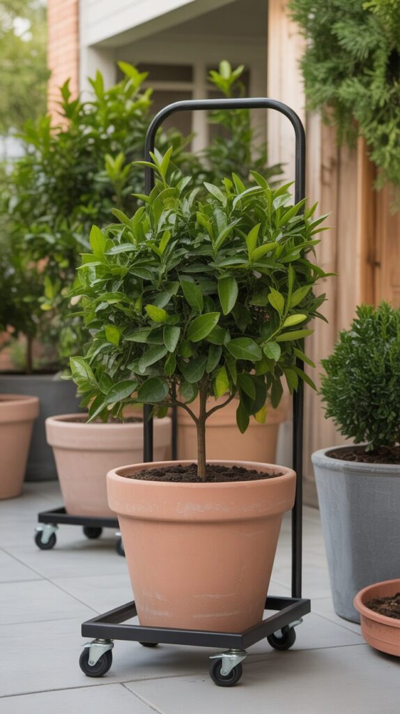 Because citrus pots can be heavy when filled with soil and water, rolling plant caddies are a practical addition. They allow you to move trees indoors during colder months or reposition them outdoors for maximum sunlight. This flexibility helps protect your plants from temperature changes and ensures optimal growth.