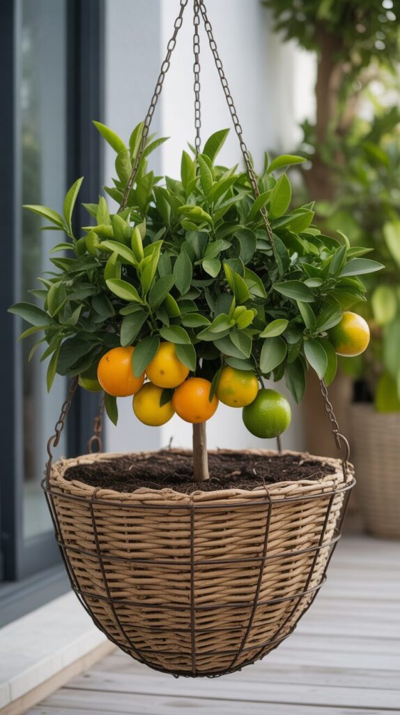 For small patios and balconies, reinforced hanging baskets can be used to grow compact citrus trees. This clever idea saves floor space while adding greenery and fruit overhead. With proper support and lightweight soil, hanging citrus creates a unique focal point that feels both modern and whimsical.