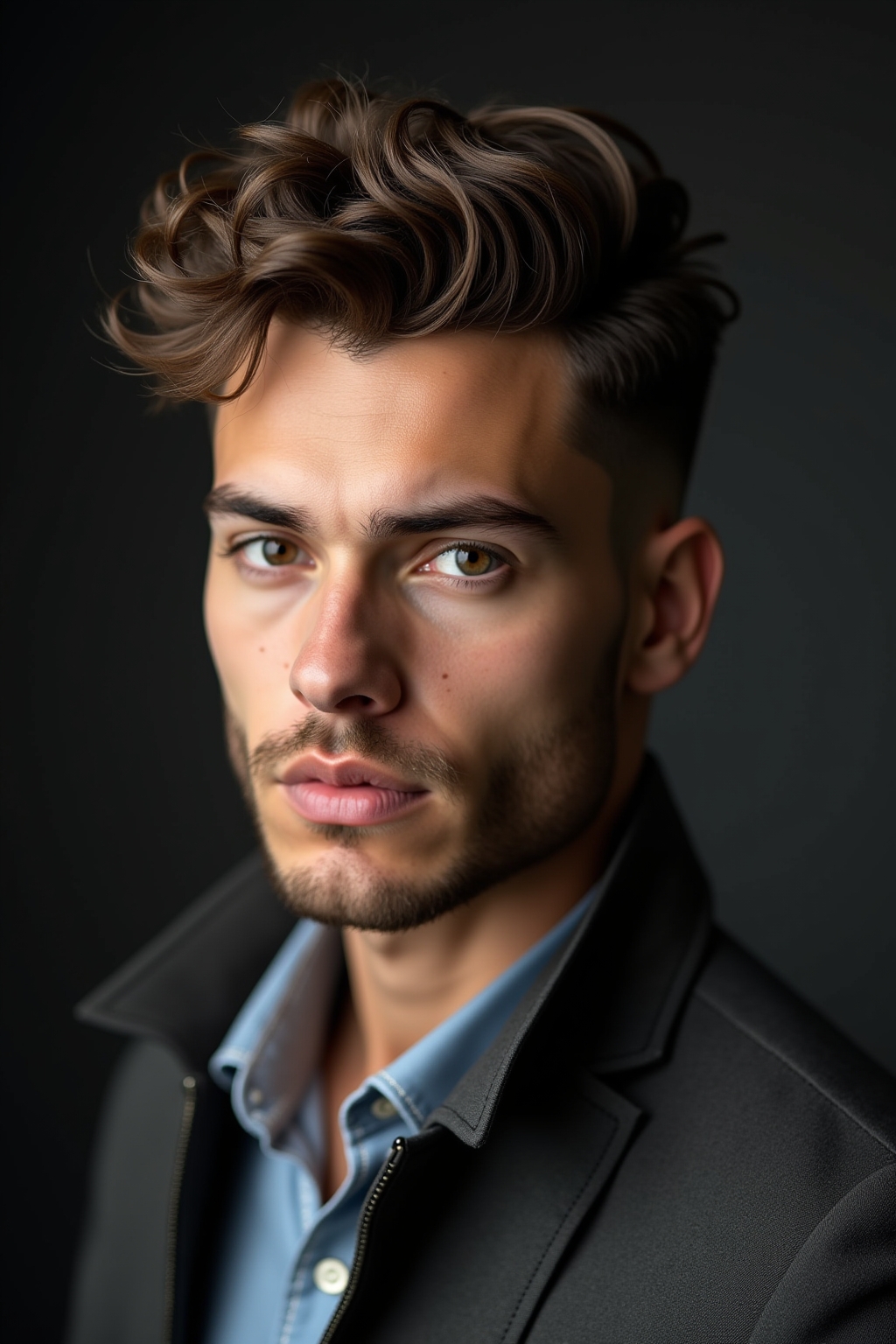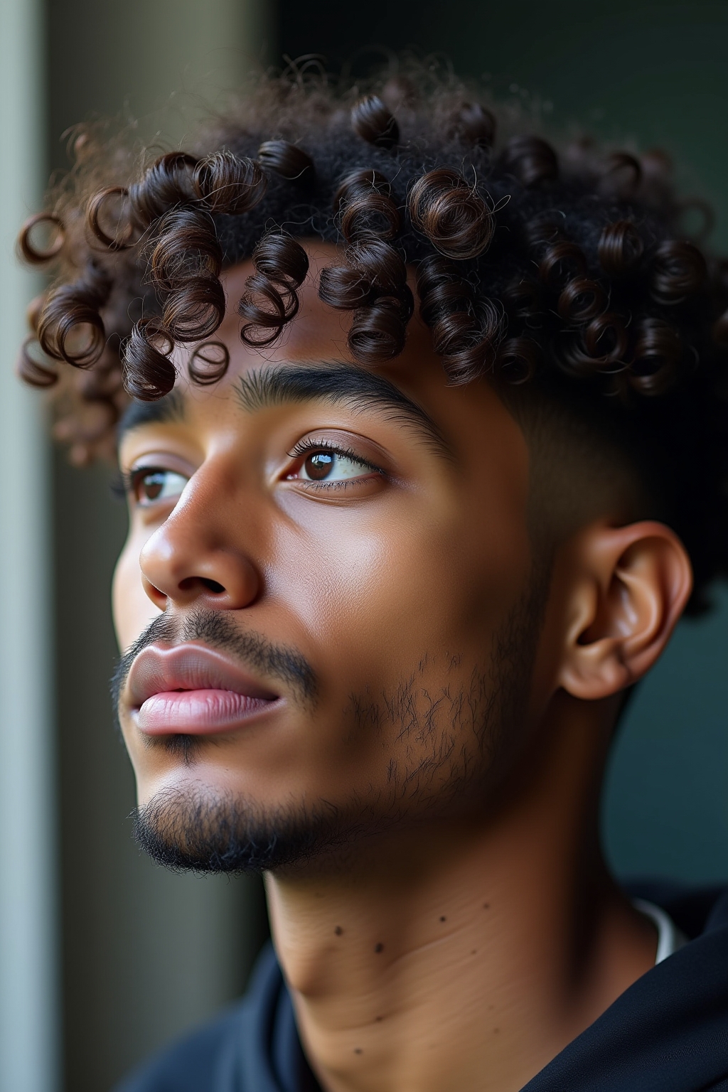 Der Curly Taper Fade ist ein vielseitiger Haarschnitt, der sich für verschiedene Gesichtsformen eignet, besonders vorteilhaft ist er jedoch für ovale, eckige und herzförmige Gesichter. Bei runden Gesichtern schafft die Höhe der Locken oben eine verlängernde Wirkung, während der Fade an den Seiten für Definition sorgt. Für längliche Gesichter empfiehlt sich, mehr Volumen an den Seiten zu belassen, um die Gesichtsproportionen auszugleichen. Markante Kieferlinien werden durch den klaren Übergang des Tapers betont, was besonders bei kantigen Gesichtszügen vorteilhaft wirkt. Die Anpassungsfähigkeit dieser Frisur erlaubt es dem Friseur, den Grad des Fades und die Lockenlänge individuell auf die Gesichtskontur abzustimmen. Die natürliche Textur der Locken bringt zudem eine weiche Komponente, die harte Gesichtszüge ausbalancieren kann.